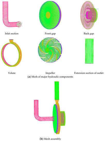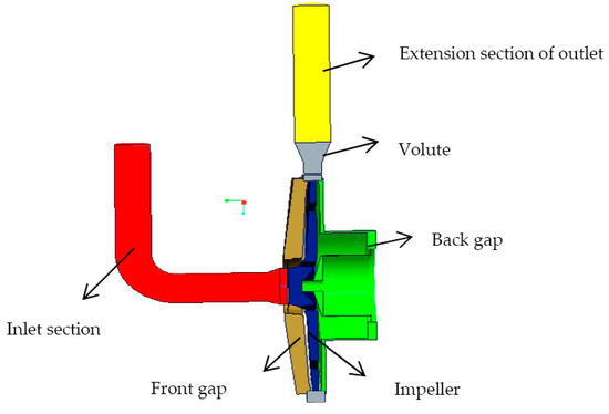 The computational domain of the whole flow field mainly includes the inlet pipe fluid, the impeller internal fluid, the pump internal fluid, the cooling circulating fluid in the pump, and the outlet pipe fluid. As shown in Figure 4, the inlet and outlet sections were extended appropriately in order to obtain stable inlet and outlet flow.