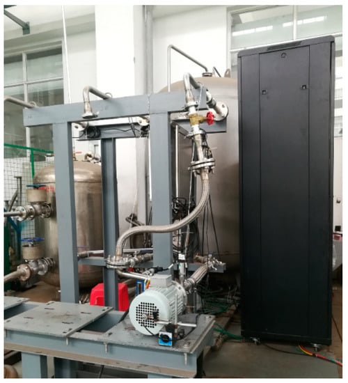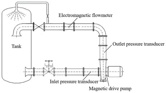 The prototype pump experiment was carried out at the special pump test bench in the National Pump Engineering Technology Research Center of Jiangsu University. Schematic diagram of the magnetic drive pump test bench structure is shown in Figure 6, and Figure 7 is the scene of magnetic drive pump experiment.