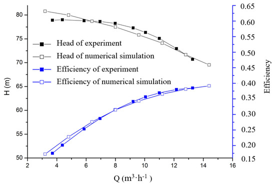 To verify the reliability of the numerical calculation, the numerical calculation results at different flow rate conditions were compared with the experimental data of the magnetic drive pump prototype. The external characteristic curves drawn by the experimental data at different flow rate conditions were compared with the ANSYS-CFX numerical simulation results, as shown in Figure 8.