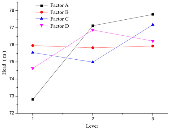 As can be seen in Table 6, factor A (73.602%) has the decisive influence on head. Factor D (13.411%) and factor C (12.941%) influence the head greatly, while factor B (0.046%) has the least influence on the head.