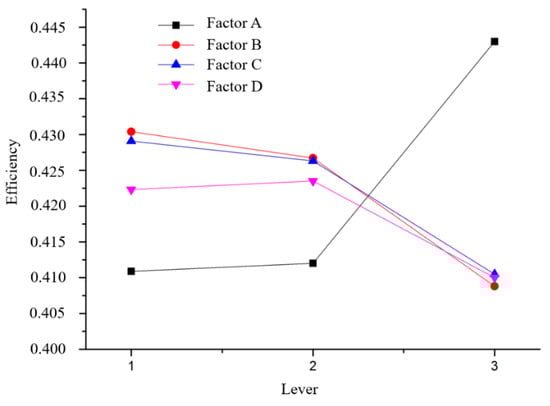 According to the principle of the orthogonal test, the influence of the factors on the result is directly proportional to the magnitude of the range. Therefore, the sequence of factors affecting the head of the magnetic drive pump is ADCB, namely, blades number, deflection angle, inlet diameter of splitter blades, and bias angle in the peripheral direction. The sequence of factors affecting the efficiency of the magnetic drive pump is ABCD, namely, blades number, bias angle in the peripheral direction, inlet diameter of splitter blades, and deflection angle. The effects of various factors on head and efficiency are shown in Figure 10 and Figure 11, respectively.