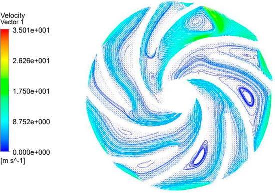 Comparisons of impeller performance between Scheme 7 (Z = 5, θs = 0.4θ, Dsi = 0.75D2, α = 0°) and Scheme 10 (Z = 5, θs = 0.4θ, Dsi = 0.55D2, α = 0°) is shown in Figure 14. The head of Scheme 10 is 77.12 m, which is lower than that of Scheme 7 (80.07 m). The efficiency of Scheme 10 is 45.59%, which is higher than that of Scheme 7 (44.15%). Scheme 7 increases the head and efficiency by 2.68% and 4.82%, respectively. Scheme 10 reduces the head by 0.33% and increases the efficiency by 8.24%. The data shows that the decrease of inlet diameter of splitter blades improves the flow condition inside the impeller, reduces the energy loss, and improves the efficiency.