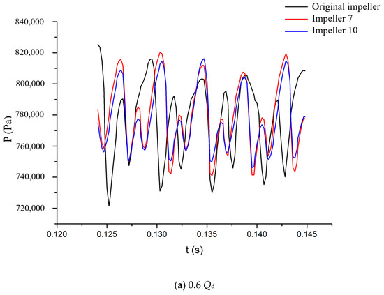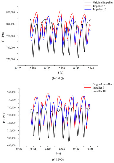 The pressure fluctuation of the original impeller, impeller 7, and impeller 10 at different flow rate conditions (0.6 Qd, 1.0 Qd and 1.5 Qd) in one period is presented in Figure 16. It can be seen from Figure 16 that the instantaneous low pressure appears in the original impeller, and the pressure fluctuation of the original impeller is the most disordered. The peak-to-peak values of pressure fluctuation of impellers 7 and 10 are smaller than those of the original impeller.