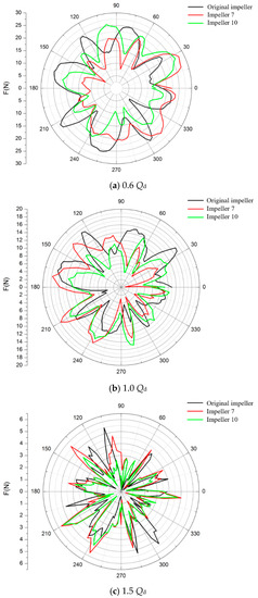 The radial forces of the original impeller, impeller 7, and impeller 10 at different flow rate conditions are shown in Figure 17. It can be seen from the figure that the radial force amplitudes of the three impellers are similar at different flow rate conditions, and the radial force gradually decreases as the flow rate increases. By comparison, the radial force circumferential distribution of impeller 10 is the most uniform at each flow rate condition.