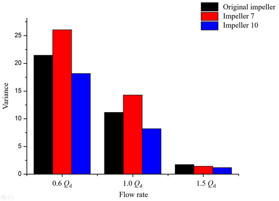The variance analysis of the radial forces of different impellers was carried out. Figure 18 shows the variance histograms of the three impellers at different flow rate conditions. It could be seen from the figure that impeller 10 has the smallest variance and impeller 7 has the largest variance at different flow rate conditions, so the radial force distribution of impeller 10 is the most stable among the three impellers.