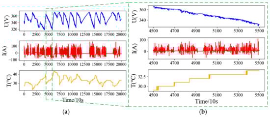 The voltage, current and temperature of the partial data are shown in Figure 1a. Figure 1b shows the voltage, current and temperature data of EVs during driving. It can be seen that the correlation between voltage and current is strong and the voltage changes with the varying current. Moreover, the current changes frequently and sharply, which is different from that under experimental conditions. The temperature also gradually increases with battery discharging.