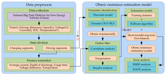 A method combining an electrical and a data-driven model is proposed to estimate the ohmic resistances of batteries. The flowchart of the proposed method is given in Figure 2. First, the operating data of EVs was extracted from the big-data platform. The raw data were divided into charging segments and driving segments according to states of EVs. Then, the Thevenin model and dynamic OCV-RLS method were used to identify the ohmic resistance. The correlation analysis was further used to extract features and the multiple boxplot analysis method was used to filter out the outliers. Finally, temperature and driving distance were used as input datasets to establish the ohmic resistance estimation model based on the XGBoost algorithm, and two error analysis methods were used to verify the reliability and accuracy of the proposed model.