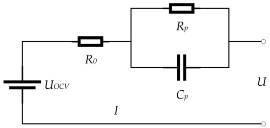 The Thevenin model is widely used in simulating battery dynamics due to its simplicity and efficiency. It consists of an ideal voltage source, a series resistor and a set of Resistance–Capacitance (RC) networks, as shown in Figure 3. In this model, U represents the battery terminal voltage, I represents the total current of the circuit, Uocv represents the battery OCV that has a non-linear relationship with the state-of-charge (SOC), R0 is the battery ohmic resistance and is an indicator of battery SOH, Rp represents the polarization resistance and Cp represents the polarization capacitance. R0 is a reflection of the instantaneous voltage drop during battery charging and discharging. The RC network is approximately equal to a nonlinear transient response and can simulate complex reactions inside the battery.