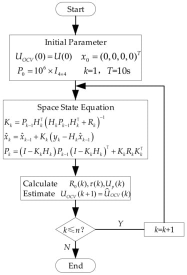 can be used as the next iteration OCV input UOCV(k + 1) and the parameter xk + 1 at the k + 1th sampling time can be calculated according to the space state equation of the RLS. The parameter identification flowchart based on the dynamic OCV–RLS method is shown in Figure 4.