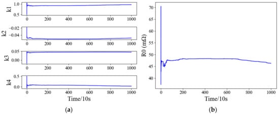 The accuracy of the parameter identification model is verified based on the vehicle data in Section 2, and the test results are shown in Figure 5a. All curves show small fluctuations during the iterations. After 200 iterations, all curves tend to converge and all parameters k can be obtained. The parameter identification results of R0 is shown in Figure 5b. It can be seen that with the discharge of the battery, the ohmic resistance is stable, indicating the parameter identification method is reliable.