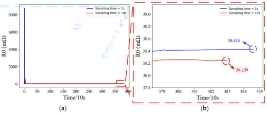 However, a 10 s sampling time is so high that it does not capture some of the battery dynamics, i.e., current peaks during the vehicle city driving with frequent start–stop intervals. In order to avoid the sampling time affecting the accuracy of resistance estimation, the EV data of 1 s and 10 s sampling times were tested by the Dynamic OCV–RLS method, respectively, in our previous work. Figure 6 shows the comparison of ohmic resistance estimation results in different sampling time. The test results show that the ohmic resistance estimation difference between the two different sampling times is 0.185 mΩ (0.484%) at the end of the curve in Figure 6b, indicating that a 10 s sampling time has little effect on the estimation accuracy of ohmic resistances.