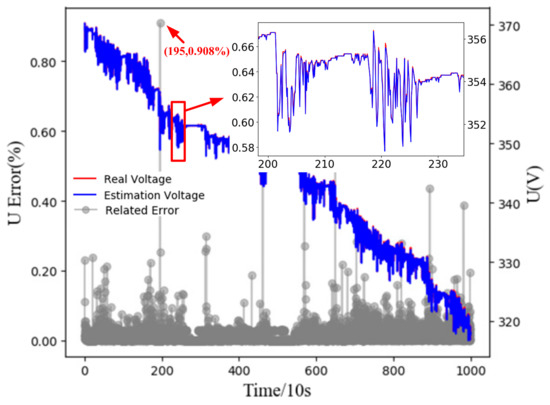 The comparison of the real voltage and the estimation voltage is shown in Figure 7. It can be seen that the real voltage curve is very close to their estimation, and the relative errors are all below 1%, and the maximum relative error is 0.908% at the 195th iteration. The results show that the established ECM and the dynamic OCV–RLS method can simulate the characteristics of the EV battery very well.
