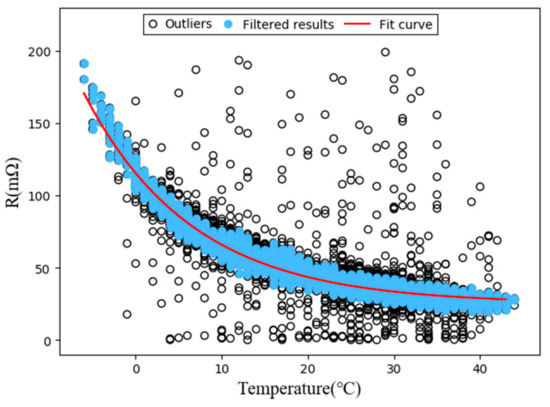 In order to guarantee the reality of ohmic resistances for the battery aging analysis, the outliers need to be filtered. According to the filtering method described in Section 3.2, the ohmic resistances at different temperatures are filtered multiple times until the dataset size no longer changes, indicating that all the outliers have been removed, and the filtered results are shown in Figure 8 with blue points.