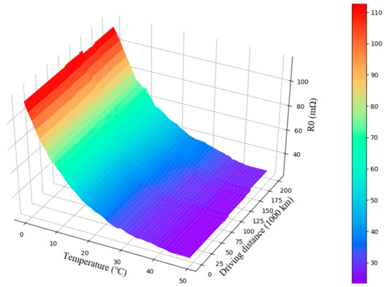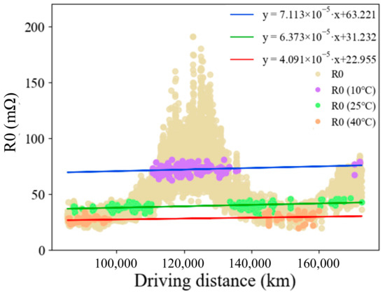 The green, red, and blue points in Figure 9 are ohmic resistances in 25 °C, 40 °C, and 10 °C, respectively. Linear regression is used to describe the rate of change for ohmic resistances with driving distance at three temperatures in Figure 9 as follows: