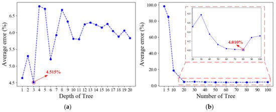 The effect of parameter settings on model accuracy. (a) The average relative error results for different tree depths; and (b) the average relative error results for different tree number.