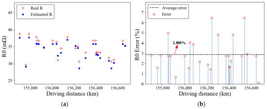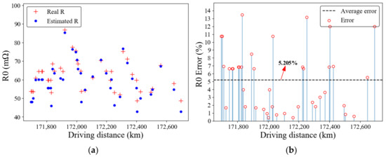The first 1000 km of test data, which is close to the time of training datasets, was used to verify the accuracy of short-term ohmic resistance estimation, and the last 1000 km of test data, which is far from to the time of training datasets, was used to verify the robustness and effectiveness of long-term ohmic resistance estimation. The short-term estimation results for the battery ohmic resistances are shown in Figure 12. It can be seen that all relative errors are low and well below 7%. The result shows that the proposed model is highly accurate for short-term battery ohmic resistance estimation.