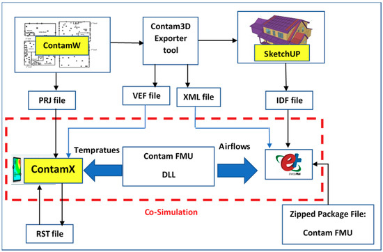 The inter-zone airflow rates provided by Equation (3) are a function of the air pressure difference between the inter-zones and the air density . The latter is a function of the zone temperatures (Equation (4)). As EnergyPlus performs the energy balance using the airflow rates calculated using CONTAM, and as the calculated zone and inter-zone temperatures via energy balance in EnergyPlus are used in the CONTAM, one can design an integrated model. As such, by co-simulating the mass and energy balances, it is possible to simultaneously simulate the energy consumption, thermal comfort, and indoor air quality.