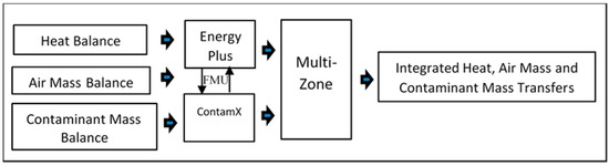 Complementary to EnergyPlus is a CONTAM (contaminant transport analysis) model that calculates the airflows in the whole multi-zone buildings [31]. The CONTAM model calculates the airflow based on the contaminating concentrations generated in the whole multi-zone buildings. This model was developed by the National Institute of Standards and Technology (NIST) for the Standardization’s Building and Fire Research Laboratory (BFRL) [32]. Currently, CONTAM assumes the airflow temperature to be the set point of the thermostat [33]. As none of these two models is able to calculate the effect of the interactions between temperature and air pressure fields, coupling between them was examined in Dols and Underhill [33]. Also, Chen et al. [34] used EnergyPlus and CHAMPS (combined heat, air, moisture, and pollutant simulation)-Multi-zone to simulate IAQ.