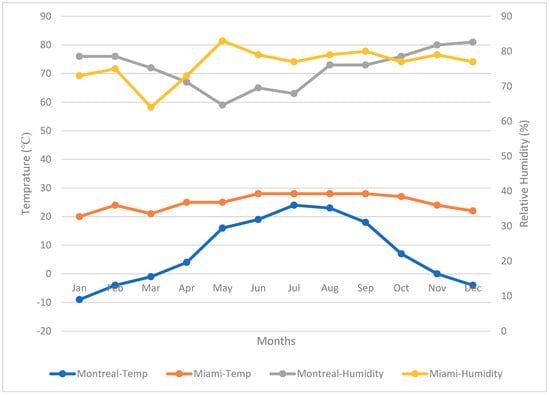 Monthly average temperature and relative humidity in the cities of Montreal and Miami [40,41].
