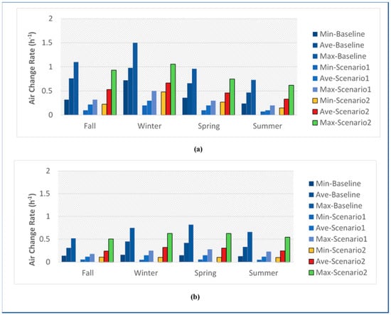 Simulation results for air change rates in the baseline, scenarios 1 and 2 for (a) Montreal [47] and (b) Miami.