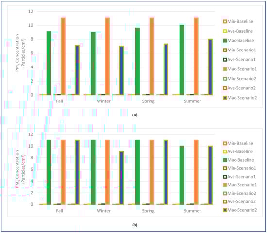 Simulation results for indoor particle concentrations (PM5) in the baseline and scenarios 1 and 2 for (a) Montreal [47] and (b) Miami.