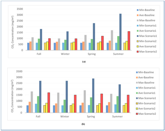 Simulations results for the indoor CO2 concentrations in the baseline and scenarios 1 and 2 for (a) Montreal and (b) Miami.