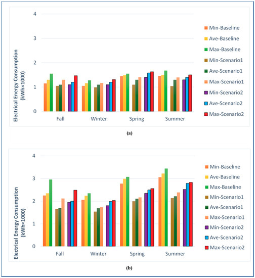 Simulation results for electrical energy consumptions in the baseline and scenarios 1 and 2 for (a) Montreal and (b) Miami.