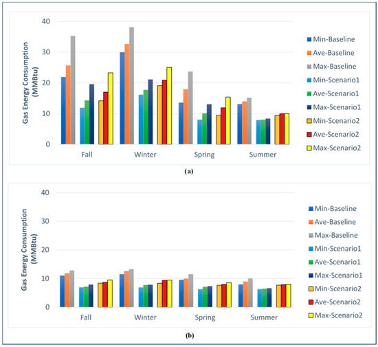 Simulations results for gas energy consumptions in the baseline and scenarios 1 and 2 for (a) Montreal [47] and (b) Miami.