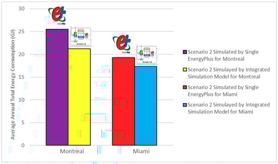 Comparison between the average annual total energy consumptions simulated by EnergyPlus and the present integrated simulation model for scenario 2 in Montreal and Miami.