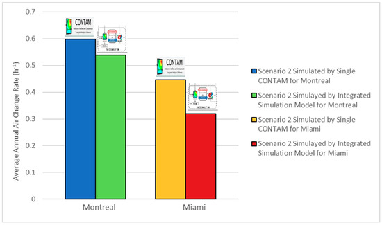 The simulation results of the average annual air change rates by CONTAM for scenario 2 were 0.597 h−1 and 0.538 h−1 for Montreal and Miami, respectively (see Table 5). These simulated IAQ measures for scenario 2 using the integrated simulation model were 0.445 h−1 and 0.318 h−1 for Montreal and Miami, respectively. Additionally, the differences between the average annual air change rates simulated using the CONTAM versus that simulated using the present integrated simulation model were 0.059 h−1 and 0.127 h−1 for Montreal and Miami, respectively (Figure 10).