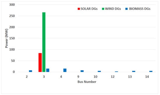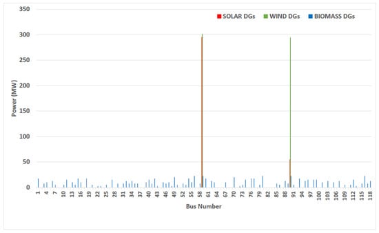 As mentioned earlier, the optimization of renewable energy DGs’ integration into DNS presented in this case study was lacking reactive power support from these generations, and the optimization results for the IEEE-118 test system are discussed below.