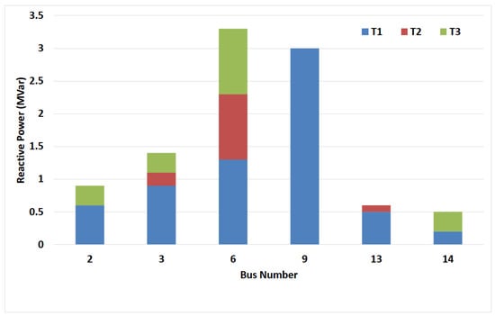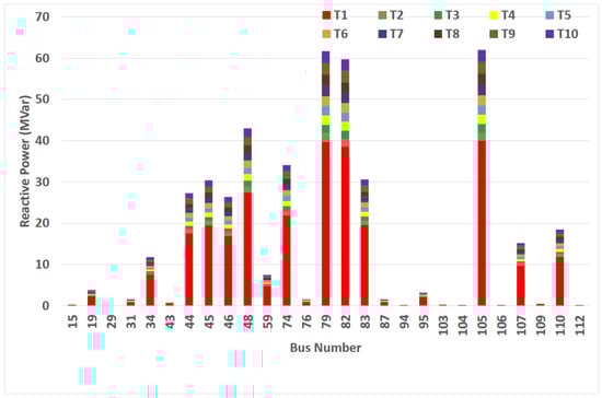 Similar to the observation in Section 6.1.1, it can be deduced from Table 5 that the optimal locations of capacitor banks were mainly on the most loaded buses and the buses close to the end of the network; thus helping to enhance network voltage stability by keeping the voltage within the limits. Figure 7 shows the total capacity of capacitor banks invested in and installed throughout the planning horizon to be 442.7 MVAr, while 285.7 MVAr, 14.1 MVAr, 15 MVAr, 15.7 MVAr, 16.4 MVAr, 17.2 MVAr, 18.3 MVAr, 19.1 MVAr, 20.1 MVAr, and 21.1 MVAr were installed at each planning stage, respectively.