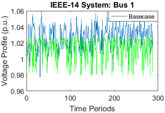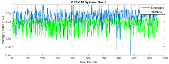 In the same vein, considerable improvement in voltage profile is noticed in Figure 8. The two plots (base case and REHDG) in Figure 8 indicate dynamic voltage profiles at any selected bus (Bus 1 in this case) during the operational periods of DNS without and with renewable generations, respectively. From Figure 8 (base case), it can be seen that the voltage levels were very close to the minimum permissible limits. Meanwhile, the voltages in Figure 8 (REHDG) were largely close to the 1.0 pu value with an average deviation of 0.13%. This allowed significant operational margins for the permissible voltage magnitude limits. Invariably, the substantial improvements in voltage profiles were due to the effect of the combined integration of renewable DGs and capacitor banks.