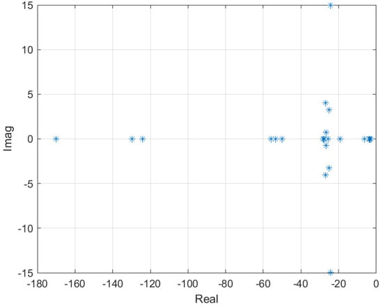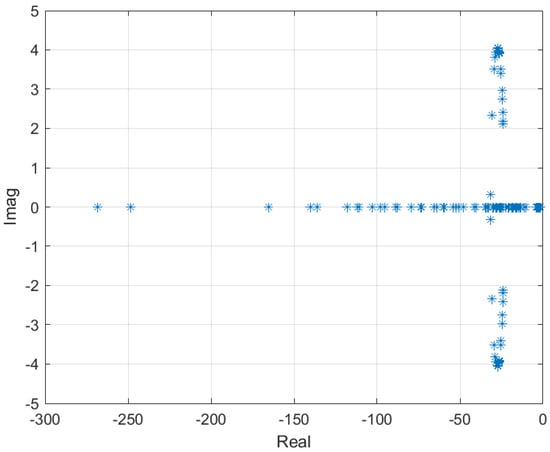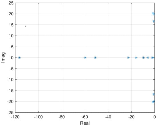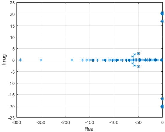 Figure 9 shows typical eigenvalue plot results for the base case system. It can be seen that the system was critically damped with a small margin to oscillatory instability. The system’s three state variables were: rotor angle , rotor speed , and transient voltage . The eigenvalues of the base case system lied away from the origin to the left half of the S-plane except the quadrature transient internal voltage eigenvalues of six generators. The oscillatory frequency and damping ratio were calculated to be 3.2738 Hz and 0.001, respectively. From Figure 10, it is shown that all the eigenvalues of the component generators were situated away to the left half of S-plane during the integration of all these renewable DGs. Figure 10 shows the eigenvalue plot of the whole network with the integration of REHDGs. Furthermore, Table 7 tabulates the critical modes of the base case system, with solar PV, wind, and biomass DGs and all the REHDGs units combined. The damping ratio of the critical mode improved from 0.001 to 0.9894 for the overall network during the integration of REHDGs.