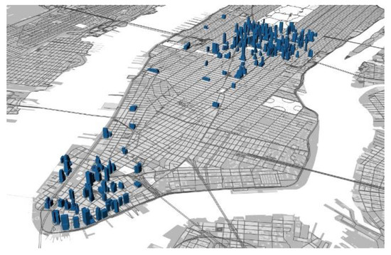 The initial benchmarking data acquired from both cities contained information on approximately 13,000 buildings in NYC and 7200 buildings in Chicago. This research focuses only on large-scale buildings used primarily for commercial offices. First, the properties whose primary and secondary use type was defined as offices with a gross floor area of 500,000 ft2 (46,452 m2) or higher were included. Other reports [5], as well as the CBEC data—public use microdata file published by the US Department of Energy [23] have used this 500,000 ft2 (46,452 m2) limit for defining the category of ‘very large’ buildings. Next, based on the provided source and site EUI, we excluded the top and bottom 5% outliers, which were approximately above 350 kBTU/ft2 (1104 kWh/m2) or below 50 kBTU/ft2 (158 kWh/m2) in case of the source EUI. These outliers included a large proportion of abnormal space use—for example, data centers or storage—and would have affected the average significantly. The final number of building samples that resulted in NYC was 221, and in Chicago, it was 106, and almost all were located in the central areas (Figure 1 and Figure 2).