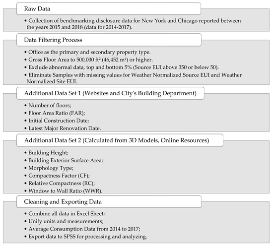The data for this research are primarily from New York and Chicago’s energy benchmarking disclosure reports from 2015 to 2018; the reported data include information from prior years of reporting [19,20,21]. The disclosure data acquired from both cities’ websites include but are not limited to the following information: building identification number (BIN), property name, address, primary and secondary property type, gross floor area, year built, Energy Star score, weather normalized site EUI, weather normalized source EUI, electricity use, natural gas use, district steam use, and oil fuel use. Additional data, such as the number of floors, floor-to-area ratio (FAR), construction, and renovation dates (latest construction dates), were added from various online resources, as indicated in Table 1. Other physical characteristics, including the compactness factor (CF), relative compactness (RC) [22], and morphology types, are generated from the 3D models. Window-to-wall ratios (WWR) are calculated based on the available plans, elevations, and photos of each selected sample building. Table 1 summarizes the data sources for each variable.