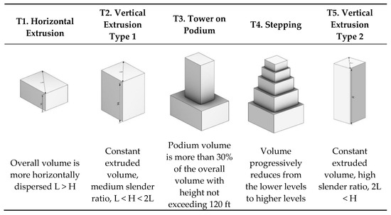 Even though previous studies present a strong correlation between this compactness aspect of a building and its energy consumption, those researches looked at buildings that are relatively small in scale and low in height [16]. For large-scale, high-rise buildings, the shapes concerning how the area is vertically distributed could have additional advantages or disadvantages for energy consumption. Hence, for this research, we have added a variable that categorizes the buildings into five types representing different forms of vertical distribution found in specific urban locations, as shown in Figure 4.