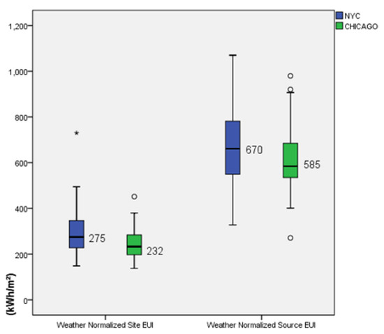 Table 2 lists a summary of the processed data, which include 221 buildings from NYC and 106 from Chicago. NYC’s median site EUI is 275 (kWh/m2), and its source EUI is 670 (kWh/m2); Chicago’s median site EUI is 232 (kWh/m2), and its source EUI is 585 (kWh/m2). Compared with the citywide medians for all offices, these numbers are approximately 10% higher in NYC and almost identical in Chicago [19], which implies no strong correlation between the building floor area and energy use intensity. One compelling aspect when we compare the two cities is that Chicago’s EUIs are lower than NYC’s (Figure 5), and this is somewhat unexpected, considering the degree-days. Chicago has a slightly colder climate, with a lower average temperature in winter and similarly in summer. During the 4 years of data collection, Chicago had approximately 1100 °C longer heating degree days (HDD) and 340 °C shorter cooling degree days (CDD) [25]. To verify the assumptions, we performed energy simulation with a generic building mass of 1000 m2 by utilizing the Prototype Building Models provided by the US Department of Energy. The results indicated Chicago was using 7% more energy. Even though detailed analysis is required for an accurate comparison, it is an industry-wide understanding that heating requires more energy than cooling. In the US, previous studies have shown a typical central air conditioner is about four times more energy-efficient than a typical furnace or boiler [26]. However, Chicago’s reported site and source EUI were lower than NYC’s, which suggests the superior energy efficiency of buildings in Chicago.