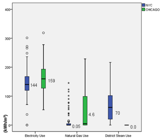 Other significant differences between the two cities were the proportion of the primary energy sources used. For example, in Chicago, most of the buildings in the selected samples used electricity as the primary energy source, reaching almost 70% of the overall consumption and approximately 20% gas; no district steam use was reported. Meanwhile, in NYC, more than 30% of the consumption relied on the district’s steam, electricity was a little over 50%, but there was very limited natural gas use (Figure 6). New York City’s district steam system of Con Edison is the largest district heating system in the Western world and has been serving Manhattan’s large-scale commercial and residential buildings since 1882 [26]. This may be an essential fact for understanding the abovementioned unexpected dynamic of the EUI. District steam systems utilize pipes for distribution, resulting in a significant energy loss in the system, lowering the efficiency of any such scheme. In modern-day district heating, these schemes have high operating and maintenance costs, make it difficult to connect to end-users (high/low-pressure interface), and have high thermal losses [27]. Also, utilizing district steam for heating and other purposes generally limits other choices for the building’s systems that could have higher efficiency. Lastly, due to the relatively small amount reported, we have excluded the fuel oil uses from our analysis.