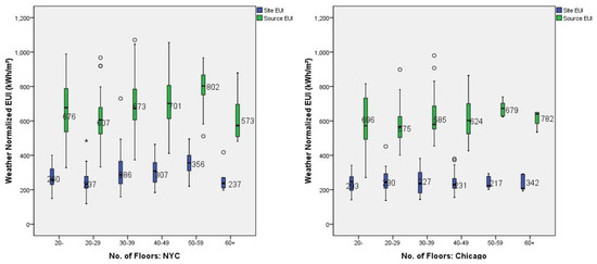 The regression result for the number of floors in this research shows a robust significance compared to other variables. In Figure 7, the box and whisker plot diagrams present the energy use intensity per group (buildings grouped based on ten-floor intervals) for ease of comparison. In NYC, the lowest median EUI was found for buildings between 20 and 30 floors, and In Chicago, the group above 60 floors. In both cities, EUI for the buildings with less than 20 floors indicated relatively higher EUI than buildings of the taller groups. Due to the limited sample numbers in some groups, it may be premature to generalize the results. However, in contrast to the previous research, the building height and energy use intensity did not show a linear relationship for large-scale, super-tall commercial buildings in these highly developed cities. Even though statistical studies have limits in explaining causes in full detail, this result potentially relates to the distribution of mechanical systems. It is common for a single technical floor to support between 15–20 floors, either above or below its location. Technical floor spacing beyond these parameters will increase losses from friction and gravity forces, which diminishes energy performance and gives rise to ongoing operation and maintenance issues [31]. Such concentrated mechanical floors are hard to incorporate in lower-height buildings; hence, these systems get scattered on the roof or in basements, reducing the efficiency of distribution. Also, the taller building groups include more buildings constructed in recent years, so more highly efficient systems are incorporated.