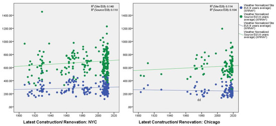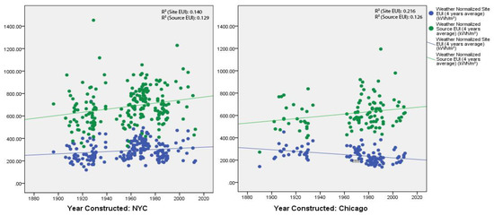 Due to the lower glazing ratio and thermal masses created by relatively thick masonry walls, some studies indicate that the pre-war buildings are generally more energy-efficient than recently constructed buildings [9]. These construction attributes are similar in both cities. However, in Chicago, the buildings constructed and renovated since 1980 clearly showed a decline in their site EUI, even though the source EUI conversion still shows an increase, while in NYC, our result coincided with previous findings (Figure 8 and Figure 9). This finding warrants attention, as the differences between the two cities may inform us of the positive factors that affect use intensity. As described in Section 2.3, New York City’s district steam system is the largest in the Western world, serving the majority of the selected samples in this research [28]. Meanwhile, of the buildings in Chicago’s sample, approximately 70% rely on electricity, and the rest rely on natural gas, as their fuel source. Including high-efficiency electrical and gas-powered heat pumps, technological advances for heating and cooling systems in recent decades could be the primary cause of this result. Due to the high reliance on district steam, especially for heating, these recent innovative systems may not have been utilized fully in NYC. Still, in the case of Chicago, the actual site EUI has benefitted from these advances over time. Currently, the site-to-source conversion factor for grid-purchased electricity in the US is 2.8, which is exceptionally high compared to other resources. However, many cleaner options are being considered to substitute for coal, which is the primary energy source used to create the majority of the electricity, and the site EUI for the electricity-dependent buildings will possibly get lower in the future. Based on this result, we could argue the installation of high-efficiency electrically dependent systems over time may result in better performing buildings than by using district systems.