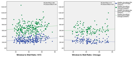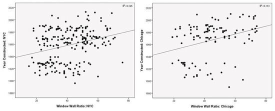 The balance between glazing and opaque areas alone has an impact on many aspects of the energy balance; it influences solar gain (and thus energy use for heating and cooling) and heat loss (mainly affecting energy use for heating), but it also impacts daylight availability (with implications on energy use for artificial light) [32]. A study by Ballarini et al. [33] on retrofitted office buildings enveloped with reduced glazing area showed significant improvements in the thermal performance and comfort; however, a daylighting reduction occurred, with a consequent higher electricity demand for lighting (36%). Consequently, many previous types of research have suggested the optimum ratio depends on climate but ranges from 30% to 50% in the case of continental climate locations similar to NYC and Chicago [34]. In both cities, the median WWR was approximately 40%, even though many buildings had a much higher or lower percentage. Our regression model indicated a significant relationship between the EUI and WWR. Without detailed information on the thermal values or the orientation of each façade, the ratio itself cannot provide an accurate evaluation of the effects. However, as presented in Figure 10, we can see the trends in NYC and Chicago were quite different. The site EUI increased in NYC, while Chicago showed a decrease with higher WWR. The recently constructed buildings have a higher WWR in general (Figure 11); these results imply that Chicago’s newly built buildings are much more energy-efficient, even overcoming the disadvantages of the higher glazing ratio. Again, we speculate that the cause of the difference is due to the limits of the district steam widely used in NYC, while Chicago has been installing high-performance systems, taking advantage of technological advances in heating and cooling systems.