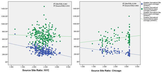Electricity from the grid, in most countries, is still considered to be one of the least-efficient fuel types; in the US, the conversion factor from site to the source is 2.8 compared to natural gas, at 1.05, and steam or hot water at 1.2. Therefore, a higher source-to-site ratio implies the building’s primary systems heavily relying on electricity rather than other resources, such as gas and district steam. Based on the benchmarking data, we calculated the site-to-source ratio for the selected samples. For both New York and Chicago, this ratio indicated the highest significance in predicting the source and site EUI. However, the trends from the two cities were not uniform, as shown in Figure 12. In NYC, a higher ratio means both the source and site EUI decreases, while in Chicago, a higher ratio means the source EUI increases but the site EUI decreases. In addition, in NYC, many buildings’ ratios are concentrated between 2–3, while the ratios for buildings in Chicago are concentrated above 3. From the results, it is clear that the more the building relies on electricity, the less the overall site EUI compared to other energy resources. Chicago’s high dependency on electricity compared to NYC also warrants attention; this could be the primary cause for the lower EUIs.