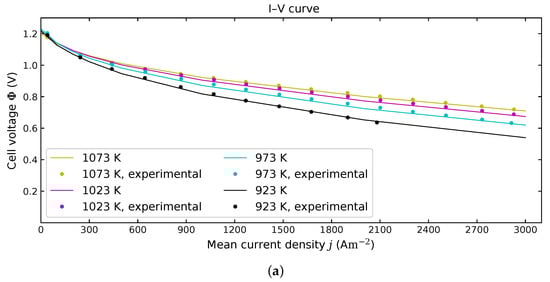 A comparison of experimental and simulated current–voltage (I–V) curves for different temperatures (a), and anode mixture compositions (b) (Operation parameters: , , , , unless specified otherwise).