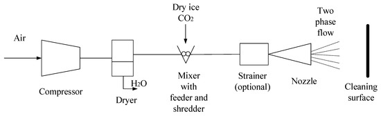 In dry ice blasting, the first step is air compression and drying. Dry ice in the form of pellets (3 mm in diameter and 5–15 mm in length) [5] is then loaded into a shredder. If pellets of smaller dimensions are required, they are run through a strainer. Dry ice is produced in a separate system [6], i.e., using the process described in [7] or on site [8] by conversion of liquid CO2 to pellets with the use of a pelletizer. Once the pellets are loaded in the two-phase dry ice blasting machine, compressed air blasts them through a nozzle on to the cleaning surface [9]. The flow parameters are highly dependent on air pressure, dry ice mass flow rate, and nozzle-surface distance. The schematics of the system is shown in Figure 1.