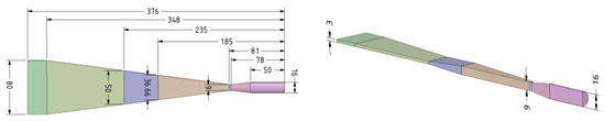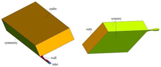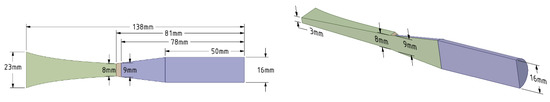Two geometries were analyzed in this paper. Geometry A is the nozzle used in the dry ice blasting application. As nozzle length is significant—can cause operational difficulties in some applications and its shape seems to be complicated—a new solution was proposed (geometry B). The analyzed geometries consist of the convergent-divergent nozzle canal, directly connected to a box where flow can be observed. As the domain has symmetrical planes, a quarter of the whole geometry was considered. In both cases, the nozzle inlet cross-section area () equals 2 cm2 and the critical cross section area ) is 0.64 cm2. The flow leaving the nozzle enters the box (0.1 × 0.3 × 0.5 m). The geometries of the analyzed nozzles are presented in Figure 2 and Figure 3.