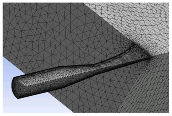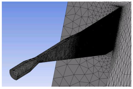As numerous simulations were planned, a grid test was done to obtain proper results at reasonable computational costs. The test results are presented for Geometry B. Four grids were taken into account, three of them generated using an automatic method, with face sizing on the nozzle wall. In the last one, an additional layering on the nozzle wall was implemented. The grid’s details are presented in Table 1. Comparing the Y+ values on the nozzle’s wall (Figure 4), grid III was selected for further simulations. An analogous process was conducted for Geometry A. One mesh from each geometry was selected for further processing (Figure 5 and Figure 6). Main mesh parameters are presented in Table 2.