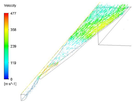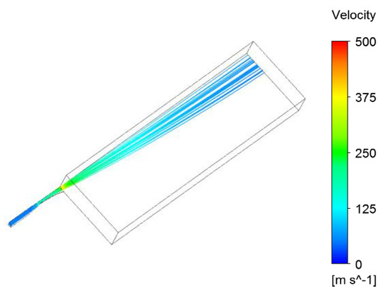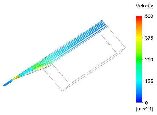 Five cases for each geometry were considered to determine the impact of operational parameters on the outlet particles’ velocity, which seems to be a crucial variable from a cleaning efficiency point of view. Details of the simulations are presented in Table 5. Infinite static pressure is the hypothetic pressure measured in the infinite tank connected to the nozzle inlet. Inlet relative static pressure is the pressure in the nozzle inlet, recalculated using formulas describing the flow via a convergent-divergent nozzle [28]. Examples of particle tracks and velocities are presented in Figure 11 and Figure 12. The example of vector plot is presented in the Figure 13.