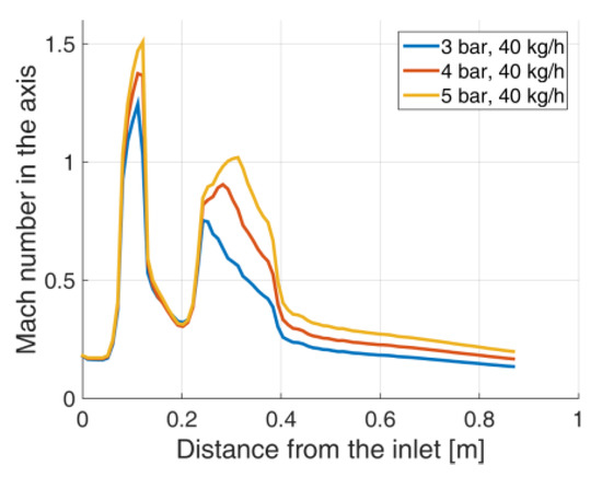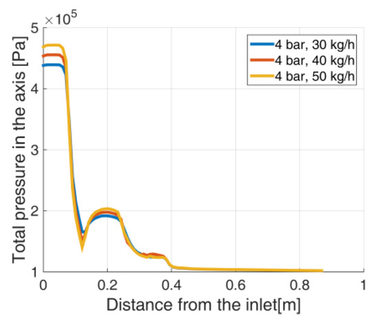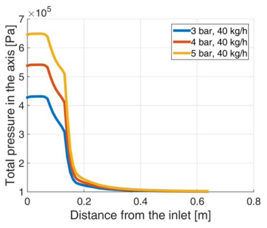 The impact of the first inlet pressure was taken into consideration. In each analyzed case, a supersonic flow occurs. As Geometry A consists of two subsequent convergent-divergent parts, axial parameters distribution differs from values obtained for the simple convergent-divergent nozzle (Geometry B) (Figure 14, Figure 15, Figure 16 and Figure 17). In the geometry A the pressure along the axis initially decrease, then reach the nozzle throat which is connected with rapid pressure drop, but this phenomena is predictable for the convergent-divergent nozzles. Further pressure growth and second decrease results from the nozzle shape. This geometry consists of two throats, what explains the functions shape (Pressure and Mach number along the axis). The flow via canal A reaches the maximum Mach number in the axis (equals to 1.5090) for the highest analyzed pressure (5 bar) (Figure 14). For Geometry B, maximum Mach number in the nozzle axis varies from 1.207 for 3 bar, up to 1.679 for 5 bar (Figure 16). As shown in Figure 15 and Figure 17, in each case, a pressure drop occurs in the critical cross-section of the nozzle. Beyond this point, no significant discrepancies in total pressure is noticed in cases having the same geometry.