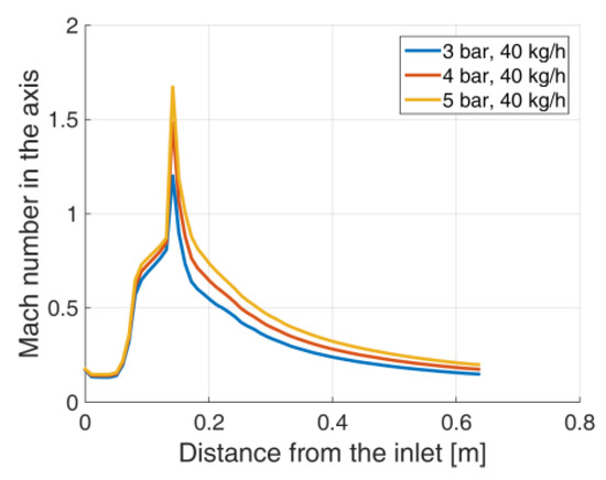 Mach number in the nozzle axis, Geometry A.